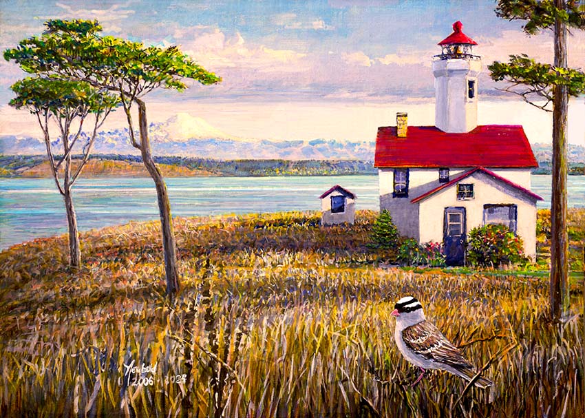 When I initially painted the painting–back in the teens sometime or maybe the oughts?– I thought I knew where this was and called it Fort Worden White-crown. Kindly people from Port Townsend illuminated the fact that this is the Point Wilson Lighthouse, however, as it is not on the Fort Worden State Park property. I remastered the painting, it’s been a long process with work continuing now through July 2025. The bird is a White-crowned Sparrow, which is notable as being one of the most capably urban native birds in the Northwest. I hear them singing at Westlake Mall. They like rock outcroppings in the high mountains with sparse vegetation such as spruce and fir to nest in. Parking lots and streets now stand in for rock outcroppings and urban plantings for the spruce and fir. It has a delightful song that is a little bit minor key, and recently made it into a Brandi Carlisle song.