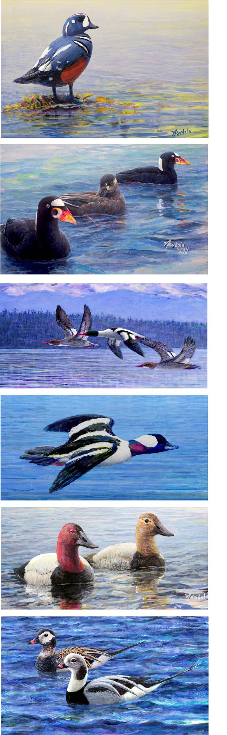 Top Painting: Harlequin Duck second: Surf Scoters 3rd: Common Mergansers (these aren’t considered Sea Ducks but in the Northwest they can sometimes be seen in numbers on the salt water; 4th Bufflehead (male in flight) 5th Canvasback pair 6th Long-tailed Duck pair