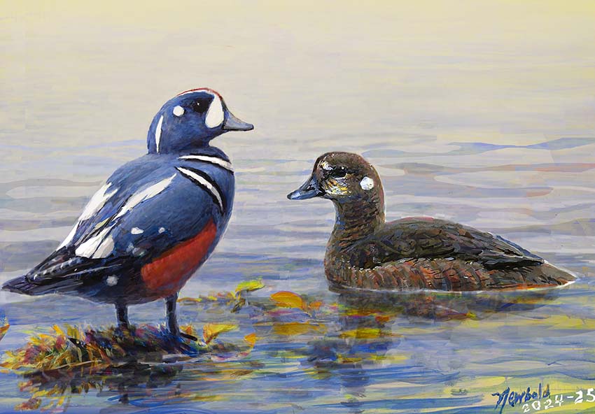 A painting of a Harlequin Duck I began in 2023. I finally figured out compositionally how I could add a female in the last week of 2025.