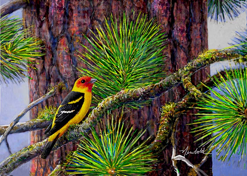 #639 Western Tanager on a Ponderosa (9 x 12 print for 11 x 14 mat)